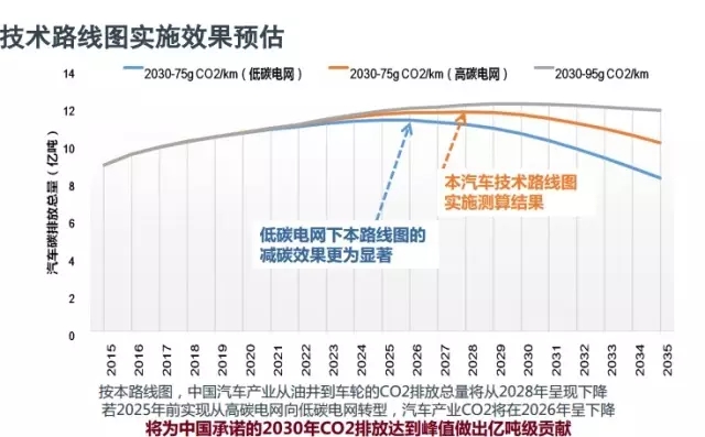 如果2030年按本次路線圖提出的75g/km、新能源汽車占銷量40%以上測(cè)算,我國(guó)汽車產(chǎn)業(yè)從油井到車輪的CO2排放總量將從2028年就開始呈現(xiàn)下降趨勢(shì),如果2025年前我國(guó)電網(wǎng)能實(shí)現(xiàn)從高碳電網(wǎng)向低碳電網(wǎng)的轉(zhuǎn)型,汽車產(chǎn)業(yè)從油井到車輪的CO2排放總量將在2026年之后就開始明顯下降。