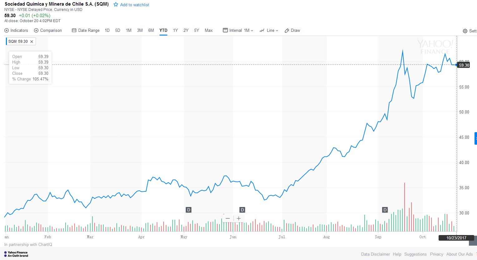 隨著各國大力發(fā)展電動車,以及出臺“禁售燃油車時間表”,鋰的需求大增。今年以來,SQM在紐交所的股價已經(jīng)上漲約105%。