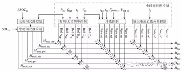 基于電動(dòng)汽車中淘汰的二次電池,本文提出一種能夠有效延長(zhǎng)儲(chǔ)能型模塊化多電平系統(tǒng)使用壽命的多時(shí)間尺度控制策略。長(zhǎng)時(shí)間尺度下,根據(jù)電池組的相對(duì)健康程度可以計(jì)算得到各子模塊的輸出功率參考,進(jìn)而獲得電池組的SOC變化曲線; 中時(shí)間尺度下通過(guò)調(diào)整子模塊的調(diào)制深度實(shí)現(xiàn)SOC曲線的跟蹤; 小時(shí)間尺度下分別對(duì)交流輸出電流和相間環(huán)流進(jìn)行有效調(diào)控,在實(shí)現(xiàn)功率分配的同時(shí)滿足儲(chǔ)能系統(tǒng)并網(wǎng)需求。