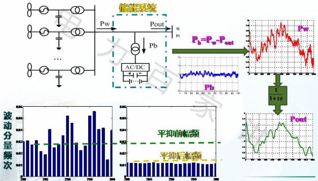 上面這張圖是儲能作用于平抑風電功率波動的典型作用示意圖,儲能通過DC/AC集中接入風電的送出端,借助拓撲結(jié)構(gòu)提升電網(wǎng)對風電的消納能力。風電輸出是間歇波動性的,通過儲能接入電網(wǎng)就會平抑很多,更受電網(wǎng)歡迎。