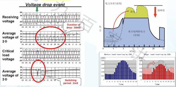 上圖體現(xiàn)了儲能在用戶端的一些作用。右邊體現(xiàn)的是儲能在用戶端經(jīng)典的作用,就是減小峰谷差,這也是儲能現(xiàn)階段唯一存在清晰商業(yè)模式的場景,高峰時刻放電,低谷時期充電,通過這種手段給用戶帶來商業(yè)價值,當然還有一個潛在的價值,削峰填谷,減少對電網(wǎng)的沖擊。