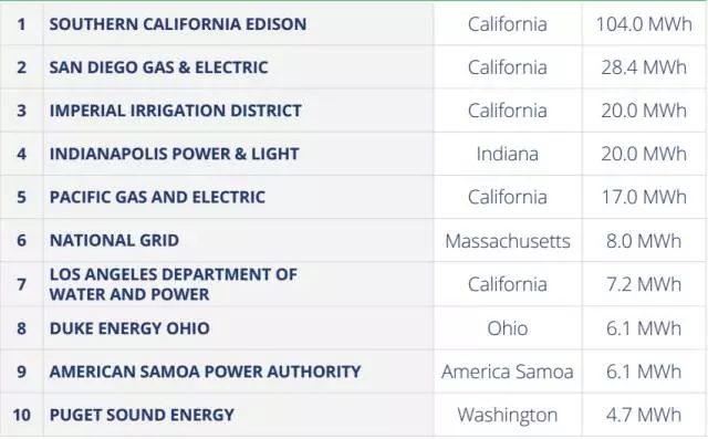 在實際需求和政策推力的共同作用下,加州公用事業(yè)公司安裝應(yīng)用儲能的力度不斷加大,成為推進加州儲能項目的最重要力量。根據(jù)美國智能電網(wǎng)聯(lián)盟(SEPA)發(fā)布的2016年公用事業(yè)公司儲能業(yè)務(wù)研究報告,2016年美國公用事業(yè)公司儲能裝機規(guī)模排行榜的前五位被SCE、SDG&E、IID、PG&E等四家加州公用事業(yè)公司所占據(jù)。
