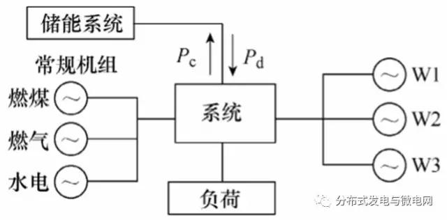 上述文獻(xiàn)在調(diào)度中對儲(chǔ)能與靈活常規(guī)電源水電、燃?xì)獾目紤]是分離的,然而在風(fēng)電大規(guī)模并網(wǎng)的形勢下,單純研究風(fēng)電與常規(guī)電源或者風(fēng)電與儲(chǔ)能的調(diào)度都具有一定的局限性。