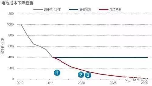 不過隨著科學技術的進一步發(fā)展,儲能電池成本也一直在持續(xù)下降,從2010年前后的超過1000美元每千瓦時已下降到目前的400美元每千瓦時。通用汽車與特斯拉分別計劃到2021年和2020年將電池組件成本降低到120美元每千瓦時和100美元每千瓦時。