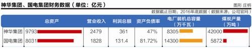 截至2017年4月底,神華集團的總資產(chǎn)達10143億元,突破萬億。其2016年營業(yè)收入2479億元,實現(xiàn)利潤361億元。而國電集團截至2016年底總資產(chǎn)達到8031億人民幣,2016年營收1828億元。