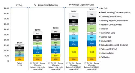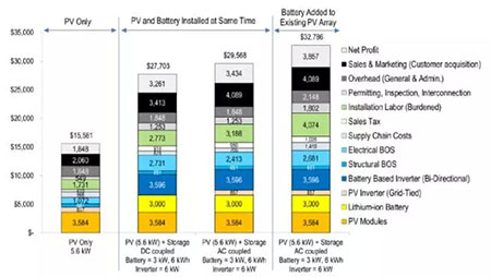 我們發(fā)現(xiàn),使用5.6千瓦太陽(yáng)能光伏板和3千瓦/6千瓦時(shí)鋰離子電池的小型電池案例的基準(zhǔn)價(jià)格大約是單一的與電網(wǎng)相連的5.6千瓦太陽(yáng)能光伏系統(tǒng)的2倍(詳情請(qǐng)參考圖1)。對(duì)新裝太陽(yáng)能光伏+儲(chǔ)能系統(tǒng)而言,直流系統(tǒng)的價(jià)格(27,703美元)比交流系統(tǒng)的價(jià)格(29,568美元)低1,865美元。交流系統(tǒng)的價(jià)格溢價(jià)主要是由于交流配置所需的額外并網(wǎng)換流器造成的硬件和人工成本。然而,在對(duì)比交流與直流系統(tǒng)時(shí),安裝價(jià)格并不是唯一的考慮因素:交流系統(tǒng)在光伏能源即發(fā)即用的應(yīng)用中效率更高,而直流系統(tǒng)則在光伏能源儲(chǔ)存儲(chǔ)的應(yīng)用中更有效率。