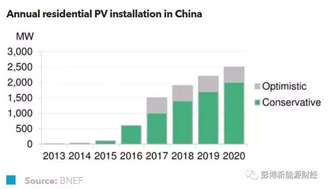 2017年,中國(guó)的戶用光伏新增裝機(jī)容量會(huì)超過(guò)1GW,超過(guò)2016年為止的累計(jì)裝機(jī)容量。BNEF預(yù)測(cè),至2020年,中國(guó)的家庭屋頂光伏累計(jì)裝機(jī)容量將接近10GW,至2040年將超過(guò)100GW。
