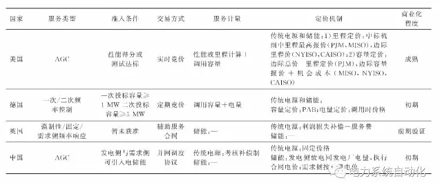 美國實時AGC競價市場從準入到定價及結(jié)算均引入性能指標,對不同調(diào)頻源的適用性較廣。德國調(diào)頻市場的投標競價未限制電源種類,準入條件對容量受限型儲能有所制約,同時補償機制中效果指標的缺位容易造成儲能與傳統(tǒng)源的收益分配與實際貢獻不對等。英國儲能調(diào)頻則處于前期驗證階段,尚未配套市場規(guī)則。國內(nèi)則已明確儲能在發(fā)電與需求兩側(cè)的調(diào)頻市場主體地位及價格機制的初步規(guī)則,但缺少適用于儲能的服務(wù)計量方法,調(diào)度機構(gòu)則缺乏電儲能裝置作為獨立可控設(shè)備參與AGC調(diào)頻的調(diào)度經(jīng)驗。表2為儲能調(diào)頻相關(guān)市場規(guī)則比較。