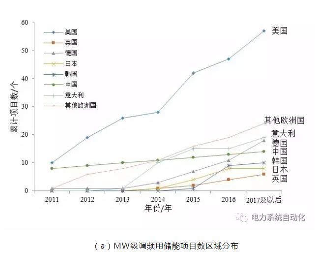 美國MW級儲能調(diào)頻項目數(shù)和裝機容量均以顯著優(yōu)勢領(lǐng)跑,意大利、德國、英國近幾年有較快發(fā)展趨勢,韓國和日本相關(guān)項目于2015~2016年受到重視,中國則每年以平穩(wěn)速度推進示范應用。