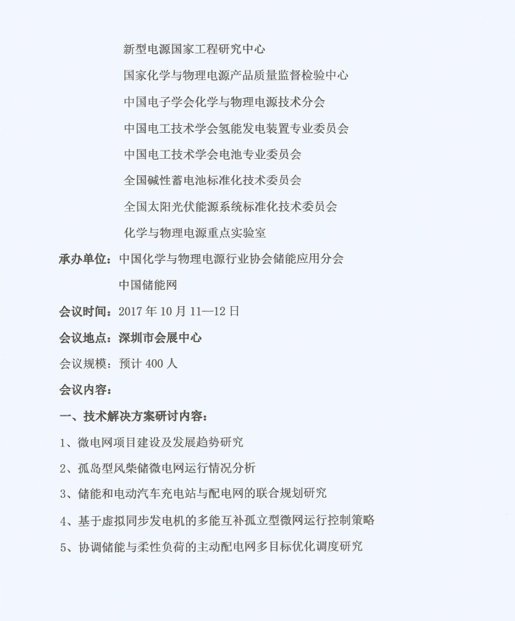為進一步探討儲能技術在分布式能源及微電網中集成應用與運營管理模式,市場交易機制研究與創(chuàng)新以及微電網標準體系建設,中國化學與物理電源行業(yè)協(xié)會聯(lián)合全國微電網與分布式電源并網標準化技術委員會于2017年10月11—12日在深圳會展中心組織開展第五屆儲能技術在分布式能源及微電網中應用高層研討會,會議同期主辦第二屆中國儲能技術及應用展覽會。現(xiàn)將有關事宜通知如下: