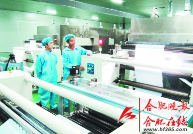 在與國(guó)軒電池同一條馬路相對(duì)一側(cè)的不遠(yuǎn)處,合肥星源新能源材料有限公司的工人們,也在生產(chǎn)車間忙碌著,總投資30億元的這家公司生產(chǎn)鋰電池濕法隔膜及涂覆隔膜。