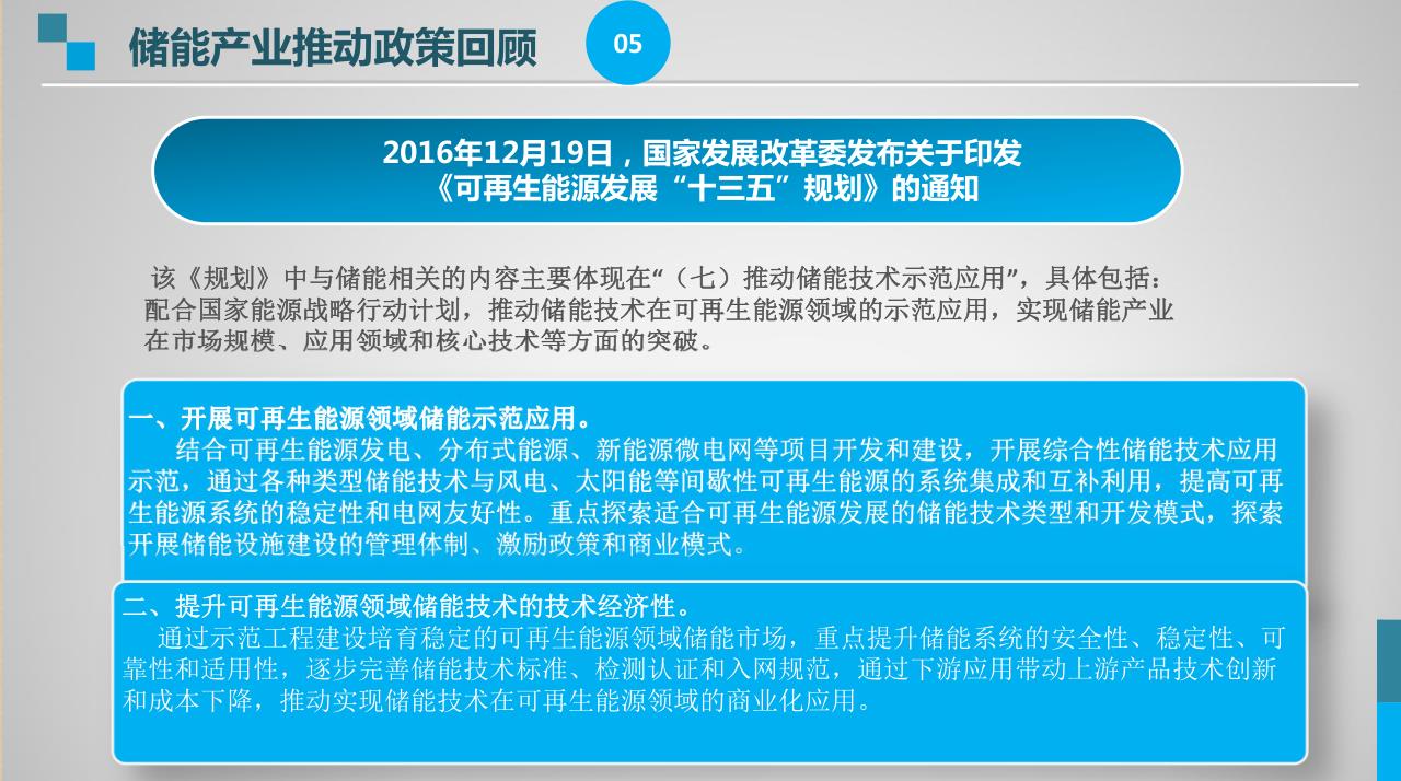 這是《“十三五”可再生能源規(guī)劃》,在第七章里面提出了推動儲能技術(shù)在可再生能源當(dāng)中應(yīng)用的示范建議。