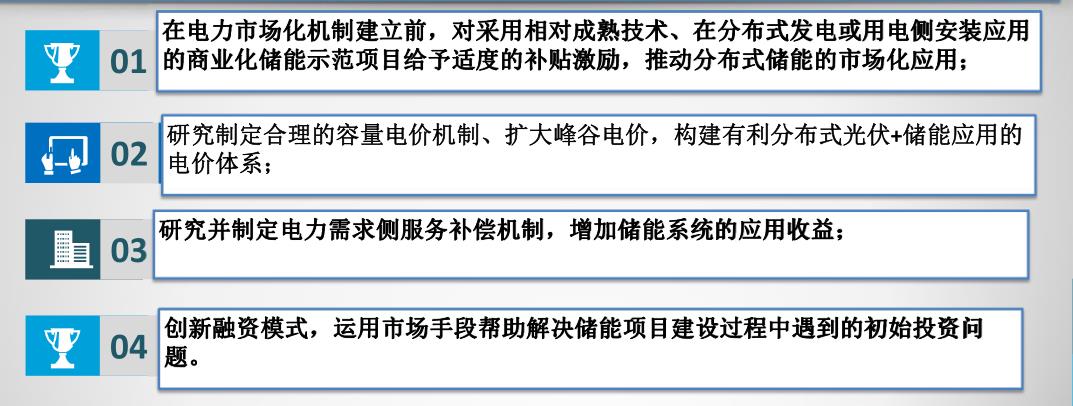 從推動儲能技術(shù)商業(yè)化方面,我們給了一些相關(guān)建議。雖然國家能源局和發(fā)改委,從報告上面作出了一系列的支持政策,但是儲能都是包含在各項規(guī)劃政策當(dāng)中,沒有具體單獨性的政策。儲能的補(bǔ)貼政策沒有落地,所以我們認(rèn)為要借鑒一些國際經(jīng)驗,同時也要符合我們國家國情,來做一個適合推動儲能產(chǎn)業(yè)發(fā)展的相關(guān)政策建議。