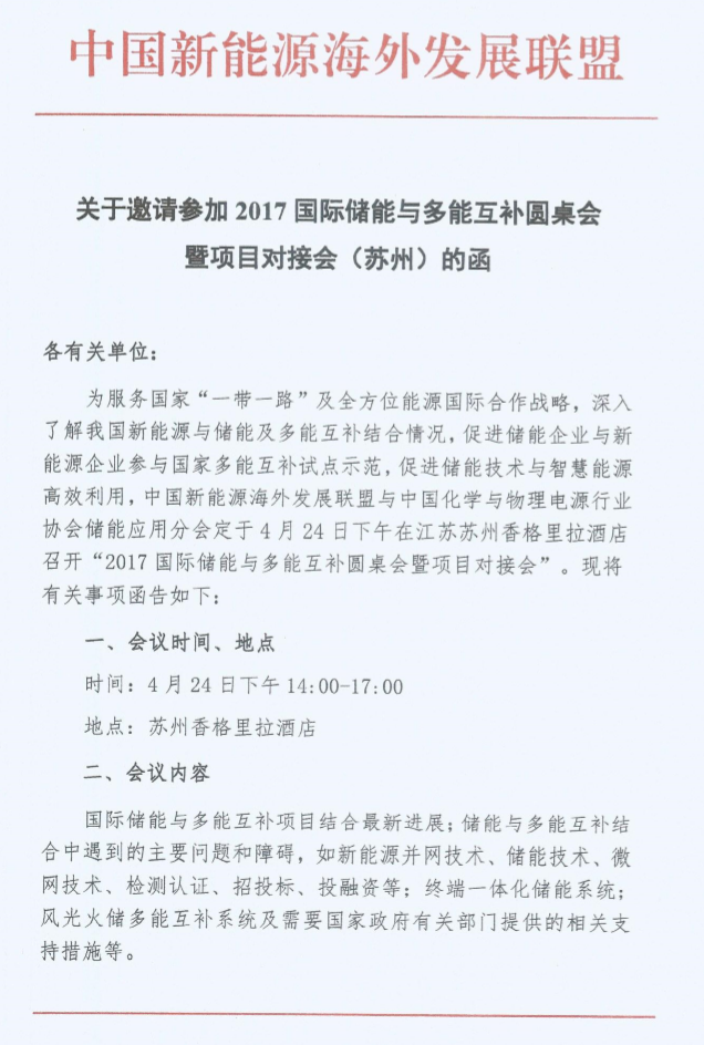 關(guān)于邀請參加2017國際儲能與多能互補(bǔ)圓桌會