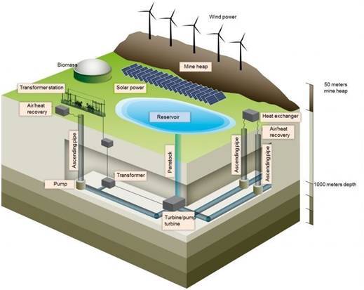 對(duì)于Prosper-Haniel工廠的情況,下層水庫將由長(zhǎng)約16英里(25000米)深達(dá)4000英尺(1200米)的礦井組成。該站的200兆瓦水力發(fā)電將適應(yīng)生物質(zhì)能、太陽能和風(fēng)力發(fā)電的組合。這并不是什么永動(dòng)機(jī),而是儲(chǔ)存在表層中的水將作為備用“電池”,在其他能源短缺時(shí),來填補(bǔ)供電的空白。