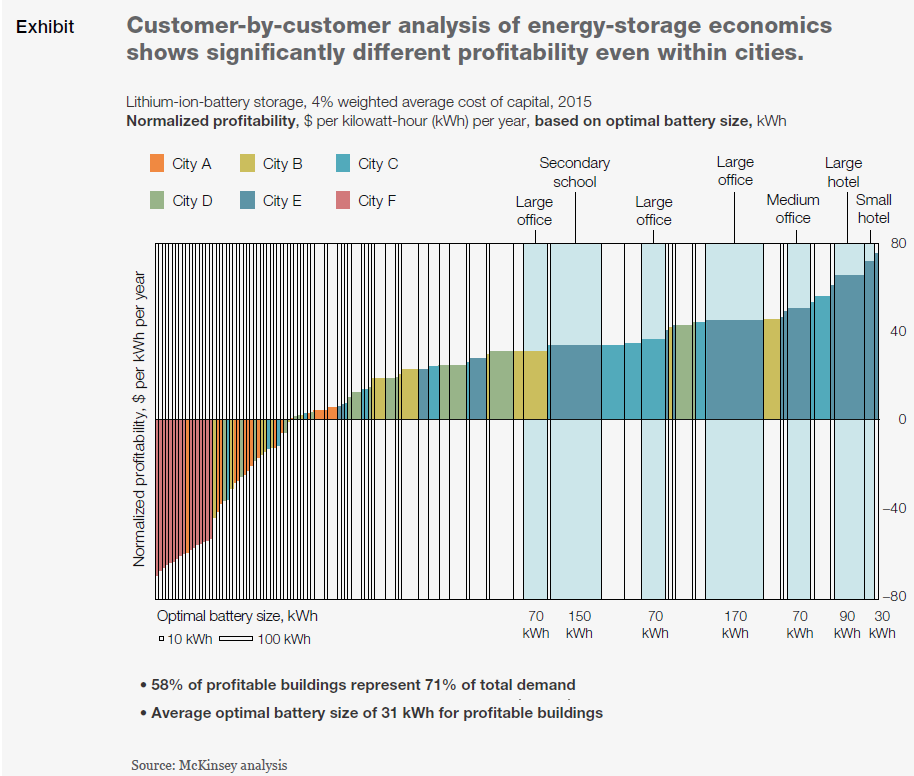 麥肯錫研究了上千戶的負(fù)荷曲線,幾十種電池技術(shù),以及數(shù)百種地區(qū)性電價(jià),以明確儲(chǔ)能盈利的可能性,類型和盈利程度。麥肯錫做這場(chǎng)研究的目的是幫助展示美國(guó)在哪里可以找到有利的市場(chǎng)條件。