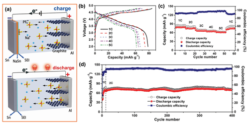 結(jié)合鈉離子與雙離子電池的綜合優(yōu)點,唐永炳及其團隊成員圣茂華、張帆、季必發(fā)等人成功研發(fā)出一種全新的基于鈉離子電解液的新型高性能、低成本錫-石墨雙離子電池。該電池直接采用錫箔同時作為電池負極和集流體,石墨作為正極;電解液采用廉價易得的六氟磷酸鈉作為鈉鹽電解質(zhì)溶于有機溶劑中。該新型電池具有超出預(yù)期的能量密度和較長的循環(huán)壽命,并且大幅降低了電池的生產(chǎn)成本。該新型電池的反應(yīng)機理為:充電時,電解液中的鈉離子運動到錫箔負極表面,形成鈉錫合金,同時六氟磷酸根插層到正極石墨中;放電時,負極上的鈉錫合金脫鈉,同時正極石墨中的六氟磷酸根脫嵌回到電解液中。研究結(jié)果表明,該新型鈉離子雙離子電池在2C倍率下充放電循環(huán)400圈后,仍保持94%的容量;且能量密度可達到144Wh/kg,高于現(xiàn)有傳統(tǒng)鋰離子電池能量密度。該研究成果具有巨大的產(chǎn)業(yè)化前景,并有望代替現(xiàn)有傳統(tǒng)鋰離子電池技術(shù)。