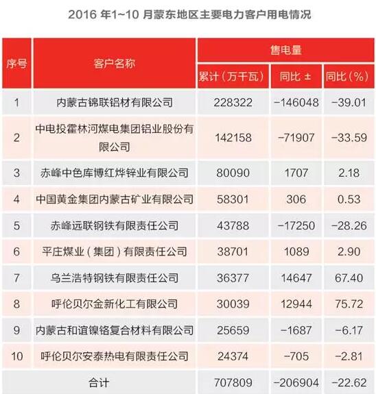 “從11個(gè)月份各主要用戶用電情況來(lái)看,區(qū)域內(nèi)主要用電企業(yè)合計(jì)購(gòu)網(wǎng)電量70.78億千瓦時(shí),同比減少22.62%,用電量總體呈下降趨勢(shì)。其中有色金屬加工、煤炭開采、化工企業(yè)售市場(chǎng)影響,售電量有所增長(zhǎng);主要電解鋁加工企業(yè)如錦聯(lián)鋁材、霍鋁公司購(gòu)網(wǎng)電量同比減少較多,主要是因?yàn)殇X價(jià)長(zhǎng)期低迷,企業(yè)生產(chǎn)積極性不高?!眲⒖茖W(xué)進(jìn)一步補(bǔ)充。