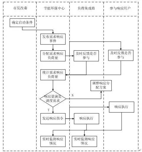 北京市電力需求側(cè)管理綜合服務(wù)平臺設(shè)需求響應(yīng)功能模塊,對各負荷集成商進行入圍和接入管理,以15分鐘為間隔實時監(jiān)測企業(yè)用電情況,響應(yīng)日前由平臺制定響應(yīng)方案,根據(jù)響應(yīng)承諾量分配應(yīng)執(zhí)行響應(yīng)負荷量,按提前通知要求向各負荷集成商下發(fā)方案,并要求反饋預(yù)測執(zhí)行信息。針對可能出現(xiàn)的反饋響應(yīng)負荷量低于分配量的情況,可根據(jù)實際需求再次調(diào)整分配響應(yīng)量,直到滿足調(diào)用負荷需求。至響應(yīng)執(zhí)行時間,平臺執(zhí)行響應(yīng)方案,并自動向各負荷集成商發(fā)出執(zhí)行信息,實時監(jiān)測響應(yīng)執(zhí)行情況。至執(zhí)行時間終止,響應(yīng)方案自動計算響應(yīng)負荷量和基準線,并展示需求響應(yīng)執(zhí)行完成情況。針對可能出現(xiàn)的數(shù)據(jù)不完整或數(shù)據(jù)錯誤的情況,平臺可二次重新計算響應(yīng)基準線和實際響應(yīng)完成量,給各負荷集成商修正和調(diào)整機會。