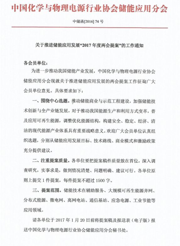 關(guān)于推進(jìn)儲(chǔ)能應(yīng)用發(fā)展“2017年度兩會(huì)提案”的工作通知