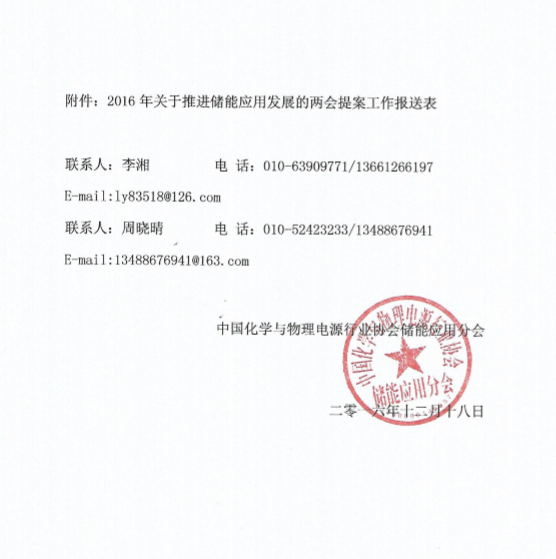 請(qǐng)各單位于2017年1月20日前將提案稿及報(bào)送表(電子版)報(bào)送中國(guó)化學(xué)與物理電源行業(yè)協(xié)會(huì)儲(chǔ)能應(yīng)用分會(huì)秘書處。
