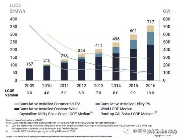 中國儲能網(wǎng)訊:美國咨詢公司Lazard每年評估美國各類能源發(fā)電的全生命周期平準成本(LCOE),2016年12月15日公布了第10個LCOE版本。