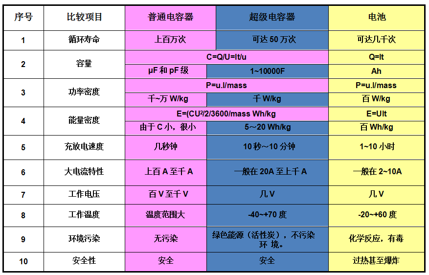 (超級(jí)電容器與電池及電容器比較表 集星科技提供)