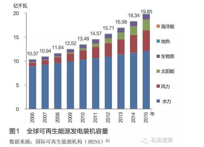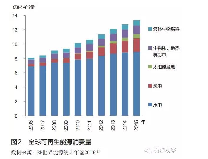 可再生能源在電力領(lǐng)域的應(yīng)用最具代表性。 全球可再生能源發(fā)電累計裝機(jī)容量從2006年的10.37億千瓦增長至2015年的19.85億千瓦, 年均增長7.49%。 其中風(fēng)力發(fā)電及太陽能發(fā)電裝機(jī)容量增幅最大, 2015年分別比上年凈增6635萬千瓦和4766萬千瓦, 遠(yuǎn)高于水電的3580萬千瓦( 見圖1) 。