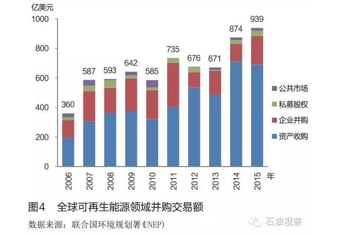 2015年, 全球可再生能源領(lǐng)域的并購交易總額達(dá)到歷史最高值的939億美元( 見圖4), 比上年增長7%。 其中資產(chǎn)收購交易額為694億美元, 企業(yè)并購交易額為192億美元, 私募股權(quán)交易額為35億美元, 公共市場股權(quán)交易額為18億美元。 從可再生能源類型來看, 風(fēng)能領(lǐng)域是并購交易的主戰(zhàn)場, 交易額共計576億美元, 比上年增長9%; 太陽能領(lǐng)域并購交易額為294億美元, 比上年增長9%; 地?zé)犷I(lǐng)域并購交易額為22億美元, 比上年增長4倍以上; 生物質(zhì)與廢棄物領(lǐng)域并購交易額為21億美元, 比上年增長10%;液體生物燃料領(lǐng)域并購交易額為17億美元, 比上年降低24%, 為歷史最低值。