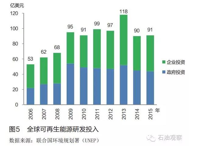 2015年, 全球可再生能源領(lǐng)域研發(fā)投入為91億美元,與上年相當(dāng)( 見圖5)。 其中政府投入為44億美元, 企業(yè)投入為47億美元。 太陽能利用領(lǐng)域研發(fā)投入為45億美元,遍及整個產(chǎn)業(yè)鏈, 例如流化床反應(yīng)器生產(chǎn)硅原料技術(shù)、 硅薄片切割用金剛石線鋸技術(shù)、 提高光電轉(zhuǎn)化效率的黑硅抗反射涂層技術(shù)等; 風(fēng)能利用領(lǐng)域研發(fā)投入為18億美元, 研發(fā)重點(diǎn)是降低陸上風(fēng)電塔頂機(jī)艙重量, 增加海上風(fēng)力發(fā)電裝機(jī)容量, 發(fā)展海上浮式風(fēng)力發(fā)電機(jī)等; 液體生物燃料領(lǐng)域研發(fā)投入為16億美元, 研發(fā)重點(diǎn)是二代燃料乙醇及生物航空燃料制備技術(shù)開發(fā)。