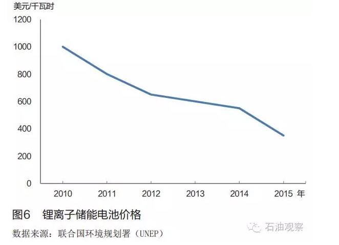 為克服可再生能源發(fā)電存在的間歇性、 不確定性等問題, 全球形成了4種可再生能源發(fā)電調(diào)峰措施: 一是基于對風(fēng)能、 太陽能等發(fā)電輸出的動態(tài)預(yù)測, 適時調(diào)動多余的發(fā)電設(shè)備或化石能源發(fā)電廠進(jìn)行輸出總量調(diào)節(jié); 二是基于能源互聯(lián)網(wǎng)技術(shù), 將過剩的電力資源輸往電力緊缺地區(qū);三是利用需求響應(yīng)機(jī)制進(jìn)行電力消耗量調(diào)節(jié); 四是發(fā)展抽水蓄能、 空氣壓縮、 電池等儲能技術(shù)。 綜合來看, 各國更重視利用儲能技術(shù)以確保電力平穩(wěn)輸出。 截至2015年, 全球投入運(yùn)行的儲能項目( 不含抽水蓄能、 壓縮空氣和儲熱) 達(dá)到327個, 總?cè)萘窟_(dá)到946.8兆瓦, 自2010年起保持18%的年均增長率。 2015年, 全球共宣布儲能項目建設(shè)計劃1220兆瓦, 其中鋰離子電池技術(shù)占79%, 鈉硫電池技術(shù)占7%。 技術(shù)進(jìn)步及批量化生產(chǎn)導(dǎo)致儲能鋰離子電池價格從2011年的1000美元/千瓦時降至2015年的350美元/千瓦時( 見圖6)。