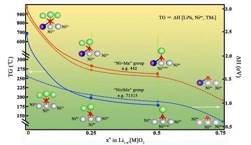 理論計算和實驗測量得到三元層狀材料充電(脫鋰)過程中起始脫氧溫度的變化