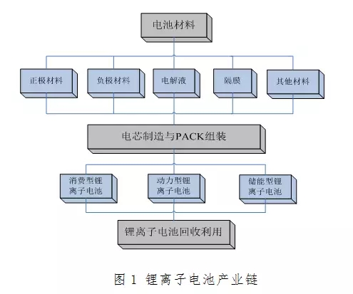 鋰離子電池生產(chǎn)工藝涉及到的產(chǎn)業(yè)鏈主要包括電池材料、電池制造和回收利用等三個(gè)部分。電池材料包括正極材料、負(fù)極材料、電解液、隔膜和相關(guān)零部件,電池制造包括電芯制造、組裝和相關(guān)制造設(shè)備制造等。產(chǎn)業(yè)鏈結(jié)構(gòu)見圖1。