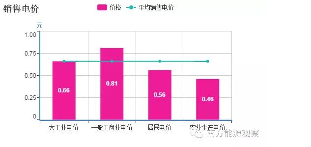 全國(guó)平均銷售電價(jià)為每千瓦時(shí)0.66元,其中大工業(yè)電價(jià)0.66元,一般工商業(yè)電價(jià)0.81元,居民電價(jià)0.56元,農(nóng)業(yè)生產(chǎn)電價(jià)0.46元。