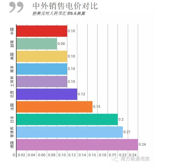從銷售電價(jià)總水平看,按美元對(duì)人民幣匯率6.6換算,中國(guó)銷售電價(jià)總水平約為每千瓦時(shí)0.10美元,高于越南(0.08美元),與美國(guó)、南非、土耳其等國(guó)家基本持平,低于巴西(0.12美元)、法國(guó)(0.15美元)、日本(0.20美元)、菲律賓(0.21美元)、德國(guó)(0.24美元)等國(guó)家。
