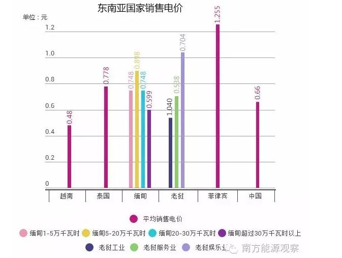 老撾的工商業(yè)電價(jià)分為三類,最高的為娛樂業(yè),為1.040元,最低的為高壓的工業(yè)0.538元,其他服務(wù)業(yè)為0.704元。菲律賓的電價(jià)高于其他東南亞國(guó)家,其中馬尼拉公司的平均銷售電價(jià)為1.255元(不含稅)。
