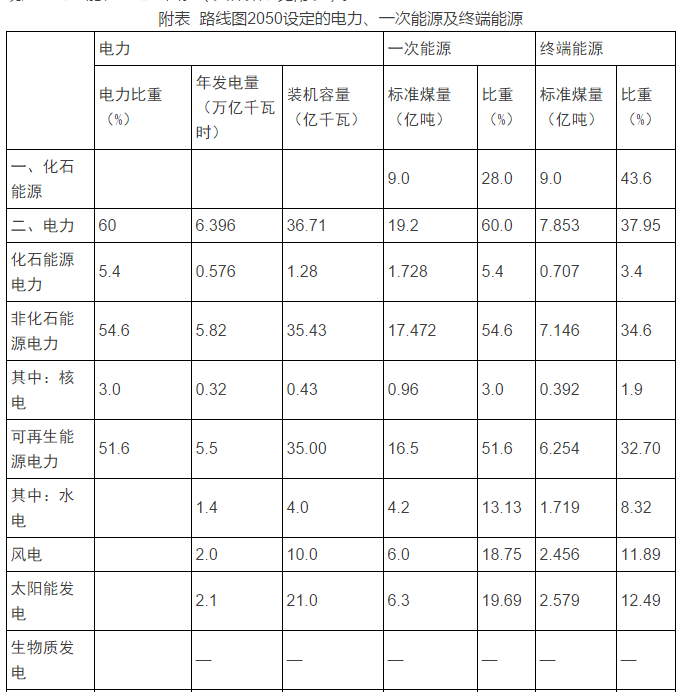 2.可再生能源電力中,風(fēng)電、太陽能電指標(biāo)是路線圖確定的,水電是按路線圖規(guī)定的可再生能源電力比重補(bǔ)充的,4億千瓦,1.4萬億千瓦時(shí)不能再多,故此處水電系常規(guī)水電,不包括抽水蓄能。由于可再生能源電力已滿,不能再加生物質(zhì)發(fā)電,此處生物質(zhì)能電力暫缺。