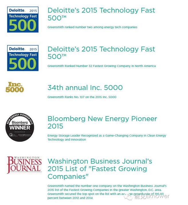 GreenSmith是一家吃“軟”飯的公司,他們的創(chuàng)新和能量儲存技術(shù)的突破關(guān)系不大,主要貢獻(xiàn)是提升了儲能系統(tǒng)控制和管理的技術(shù)水平。依靠軟件創(chuàng)新,GreenSmith獲得了不少獎項。