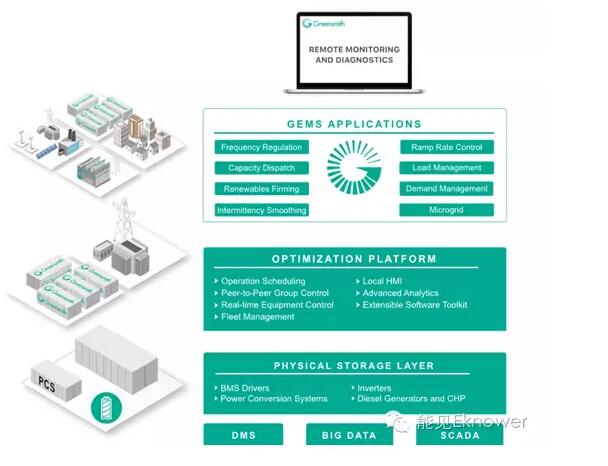 Greensmith的創(chuàng)新主要體現(xiàn)在他們的GEMS平臺。儲能集成商提供的儲能解決方案一般將控制系統(tǒng)和PCS(發(fā)電控制系統(tǒng))連接,PCS和電池組系統(tǒng)(BMS)連接,Greensmith則采用GEMS(software-based plant controller基于軟件的控制系統(tǒng))直接連接電池、PCS、BMS等系統(tǒng)。
