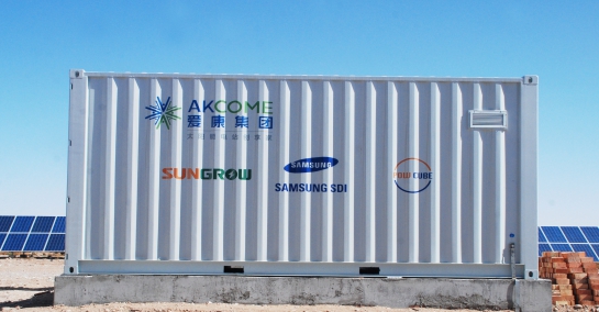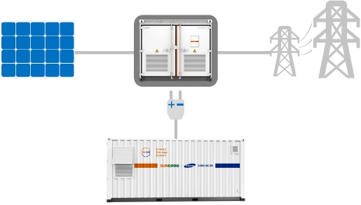陽光三星為該項(xiàng)目提供全套的設(shè)計(jì)方案,包括2臺陽光三星PowCube 550儲能系統(tǒng),該系統(tǒng)采用20呎集裝箱集成設(shè)計(jì),每臺集裝箱集成550kWh三星三元鋰電池、直流變換器、BMS、智能溫控、自動消防、配電、通訊等全套設(shè)備,并采用直流側(cè)接入方案。所謂直流側(cè)接入,即在不改變現(xiàn)有光伏電站原有設(shè)備、配置的情況下,在光伏組件與光伏逆變器的直流母線端并聯(lián)儲能系統(tǒng)。