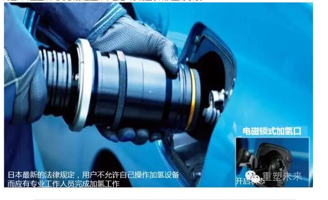 加氣槍連接到車的加氣口后被電磁機(jī)構(gòu)鎖住,安全性和電動(dòng)車充電接頭的水平相當(dāng)。同時(shí)加氣槍具有單向閥的功能,在加氣頭出現(xiàn)損壞情況下,防止氣體向外泄漏并提高加氣頭的使用壽命。管路電磁閥,在給氣瓶充氣時(shí),可有效防止氣體進(jìn)入電池。值得一提的是,日本最新法律規(guī)定,用戶不允許自己操作加氫設(shè)備,而應(yīng)由專業(yè)工作人員完成加氫工作,也是出于防止事故發(fā)生的考慮。