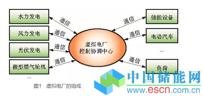 虛擬電廠的提出是為了整合各種分布式能源,包括分布式電源、可控負荷和儲能裝置等。其基本概念是通過分布式電力管理系統(tǒng)將電網(wǎng)中分布式電源、可控負荷和儲能裝置聚合成一個虛擬的可控集合體,參與電網(wǎng)的運行和調度,協(xié)調智能電網(wǎng)與分布式電源間的矛盾,充分挖掘分布式能源為電網(wǎng)和用戶所帶來的價值和效益。虛擬電廠主要由發(fā)電系統(tǒng)、儲能設備、通信系統(tǒng)構成,見圖1。