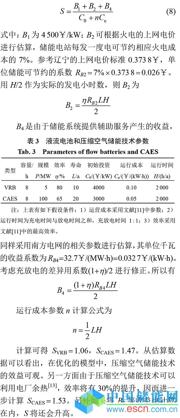 以壓縮空氣儲能和液流釩電池儲能技術為例,根據(jù)上述模型進行半定量的估算分析。為進一步簡化模型對于輔助服務部分的影響,只計算目前可以量化的B4,同時設Igov為零??紤]儲能系統(tǒng)規(guī)模差異問題,計算中單位均簡化為千瓦級的儲能裝置,相關參數(shù)如表3所示[12],計算公式為
