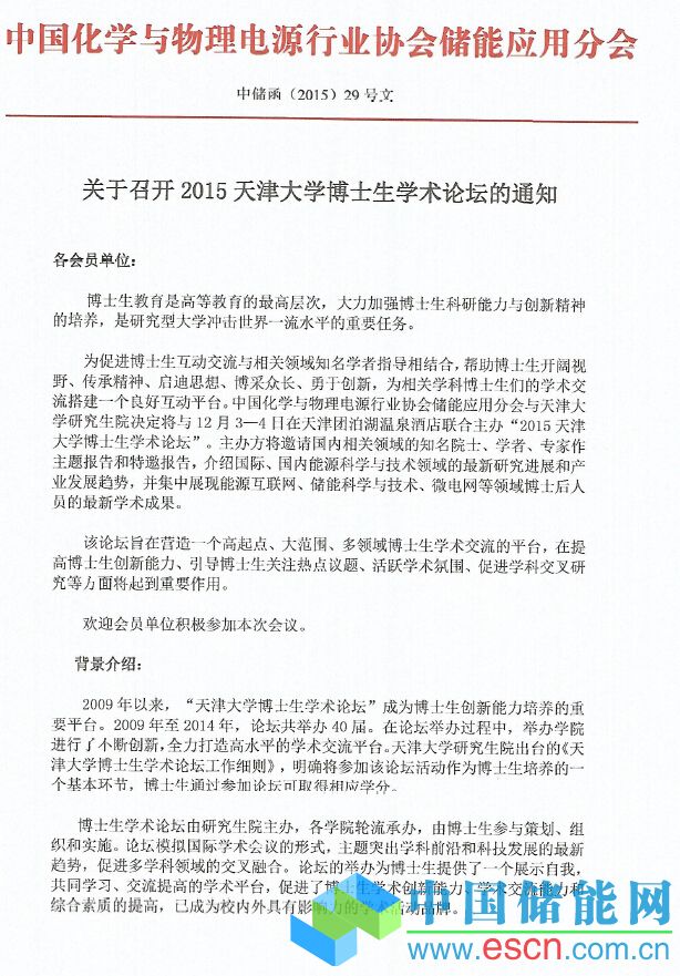 為促進博士生互動交流與相關(guān)領(lǐng)域知名學(xué)者指導(dǎo)相結(jié)合,幫助博士生開闊視野、傳承精神、啟迪思想、博采眾長、勇于創(chuàng)新,為相關(guān)學(xué)科博士生們的學(xué)術(shù)交流搭建一個良好互動平臺。中國化學(xué)與物理電源行業(yè)協(xié)會儲能應(yīng)用分會與天津大學(xué)研究生院決定將于12月3—4日在天津團泊湖溫泉酒店聯(lián)合主辦“2015天津大學(xué)博士生學(xué)術(shù)論壇”。主辦方將邀請國內(nèi)相關(guān)領(lǐng)域的知名院士、學(xué)者、專家作主題報告和特邀報告,介紹國際、國內(nèi)能源科學(xué)與技術(shù)領(lǐng)域的最新研究進展和產(chǎn)業(yè)發(fā)展趨勢,并集中展現(xiàn)能源互聯(lián)網(wǎng)、儲能科學(xué)與技術(shù)、微電網(wǎng)等領(lǐng)域博士后人員的最新學(xué)術(shù)成果。
