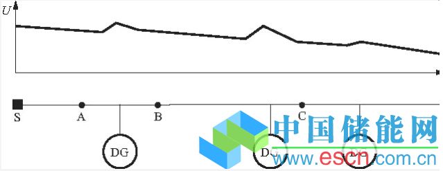 分布式電源的接入對饋線的電壓具有抬升作用,而且對于出力受自然因素影響的分布式電源(如光伏、風(fēng)電等),由于其波動性還會產(chǎn)生電壓波動,并且對其接入點的電壓抬升作用和電壓波動作用最大。對于接入多臺分布式電源的饋線,其沿線電壓分布就如同在各個分布式電源處分別由一個小棍頂著一般,在各個分布式電源的接入點形成一個個電壓極值點,見圖1。圖中,S為該饋線的變電站出線斷路器,A、B和C為分段開關(guān),DG為分布式電源,曲線縱軸U 代表沿線電壓。