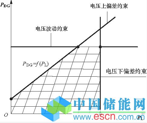 在不對分布式電源采取任何控制措施的條件下,分布式電源可接入容量必須同時滿足3個約束條件(即分布式電源接入配電網(wǎng)引起的最大電壓上偏差值與最大電壓波動值不越限,以及無分布式電源接入配電網(wǎng)時單純由負(fù)載引起的最大電壓下偏差值不越限),這3條曲線共同圍成的陰影部分區(qū)域就是不對分布式電源采取任何控制措施的條件下分布式電源的可接入容量范圍,見圖2。圖中,PDG和PL分別表示分布式電源的容量和負(fù)荷功率。
