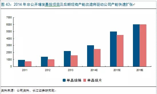 公司為全球單晶硅片龍頭企業(yè),目前具備單晶硅棒產(chǎn)能2.2GW,硅片產(chǎn)能1.6GW,2014年公司推出2GW單晶硅棒及硅片產(chǎn)能擴張的增發(fā)項目,隨著后期公司募投項目的建設投產(chǎn),以及現(xiàn)有產(chǎn)能的改造,預計公司后期產(chǎn)能將快速增長,2015、2016年有望達到4.5GW、6GW以上水平,在單晶硅片領域占有率將有望從目前的15%左右提升至30%左右。
