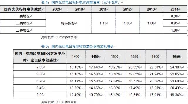 在此期間,雖然國內(nèi)光伏標桿電價同樣有所下調(diào),但成本更快的下降速度使得電站投資收益率持續(xù)上升,進而驅(qū)動國內(nèi)光伏裝機快速增長,2014年電價調(diào)整前的搶裝進一步帶動了光伏裝機增長。