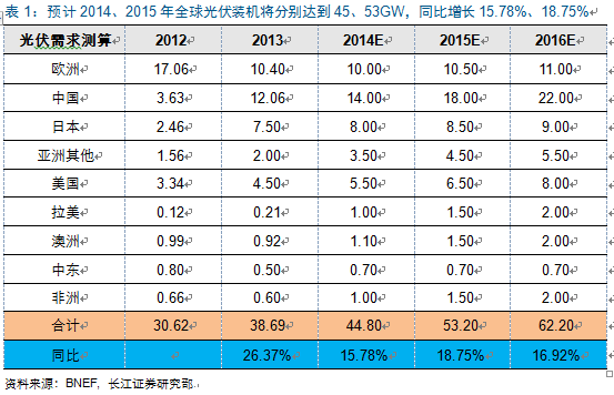 綜之,我們認為全球光伏裝機的復蘇仍將持續(xù),預計2014、2015、2016年裝機量將分別達到45、53、62GW,分別同比增長15.78%、18.75%、16.92%。