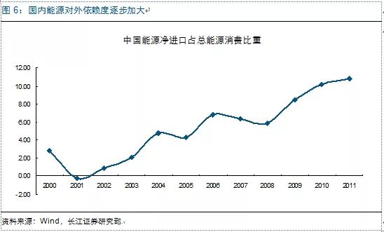 此外,由于國內(nèi)經(jīng)濟的快速增長及傳統(tǒng)化石能源的利用,國內(nèi)能源對外依賴度逐步加大,最為明顯的變化是我國由煤炭凈出口國變?yōu)槊禾績暨M口國,能源壓力加大。